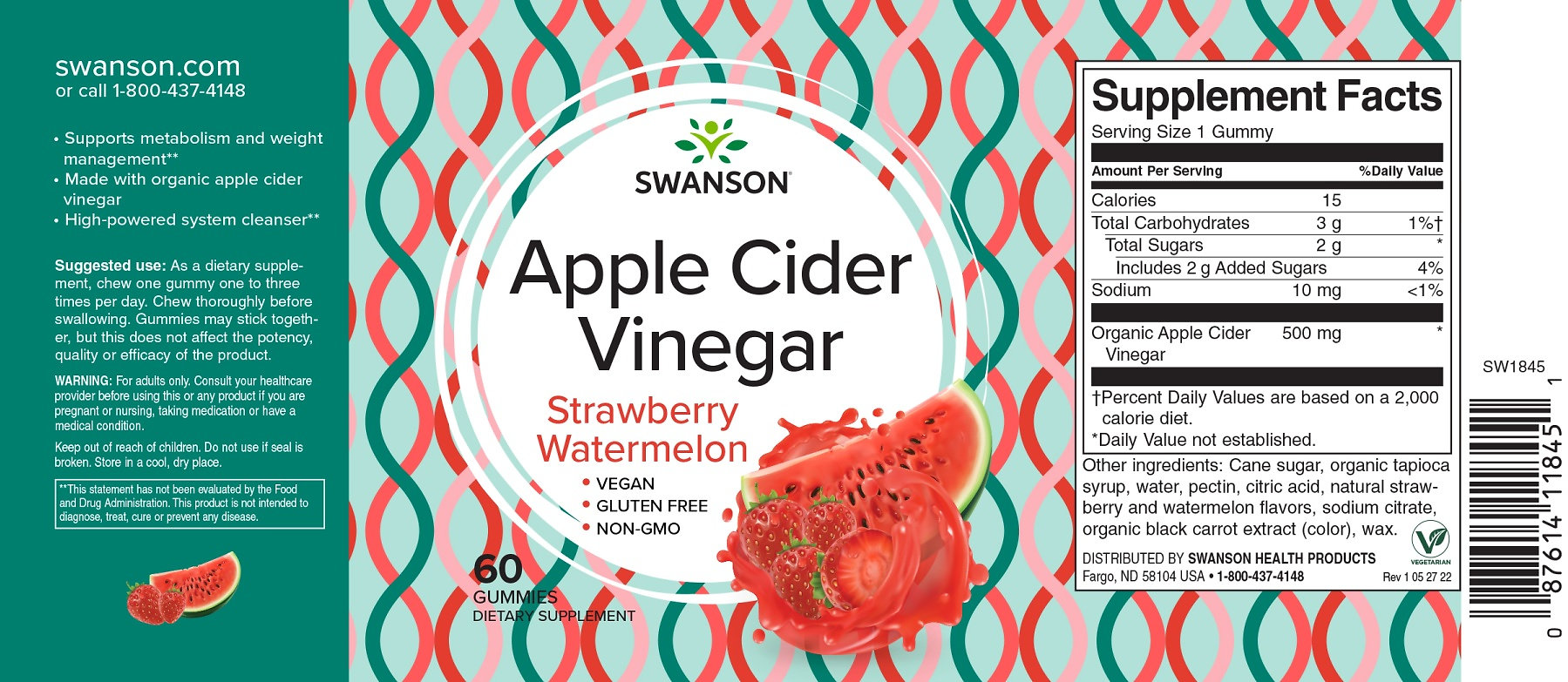 Diese veganen Fruchtgummis auf Pektinbasis liefern 500 mg Bio-Apfelessig pro Portion in einem süßen und saftigen Erdbeer-Wassermelonen-Geschmack.