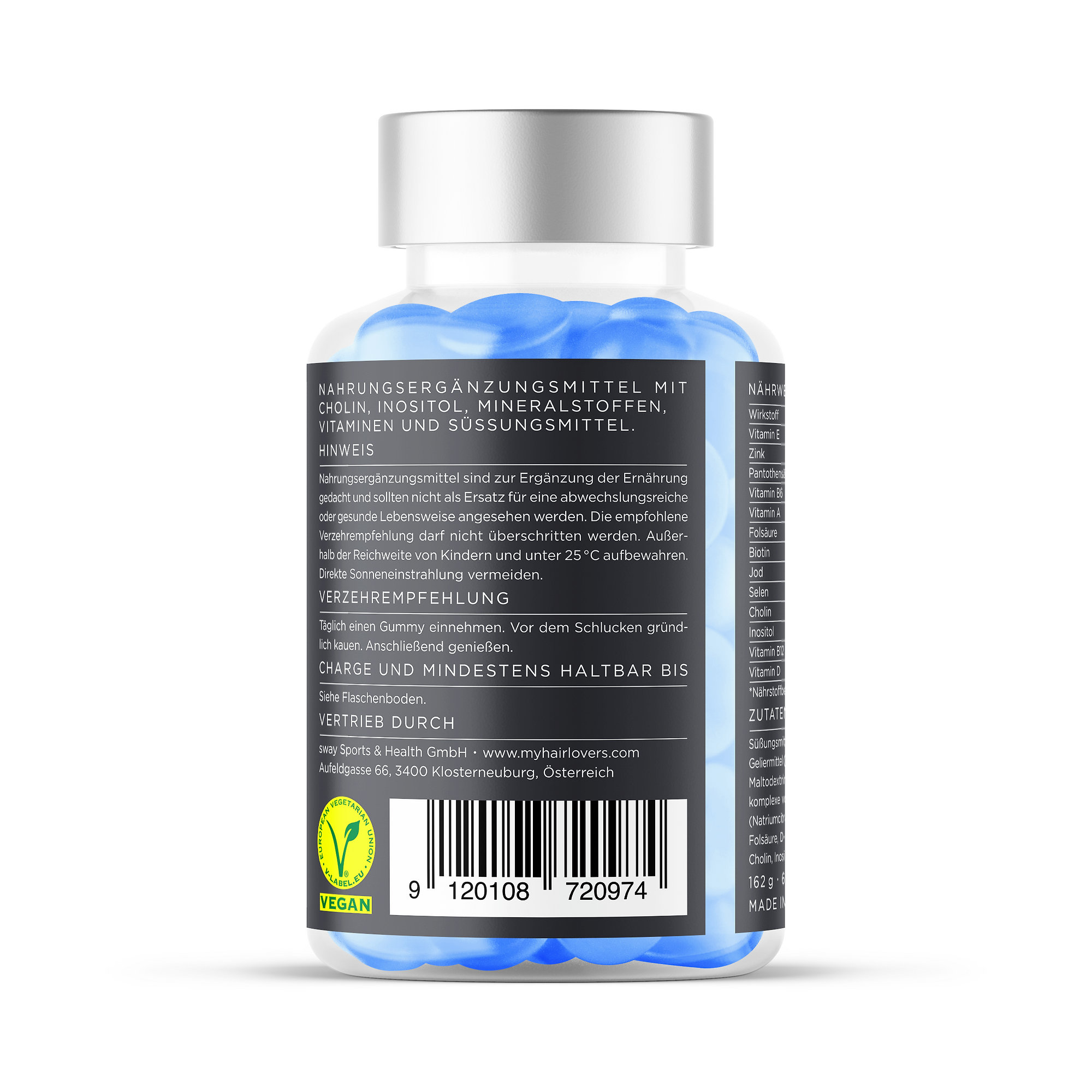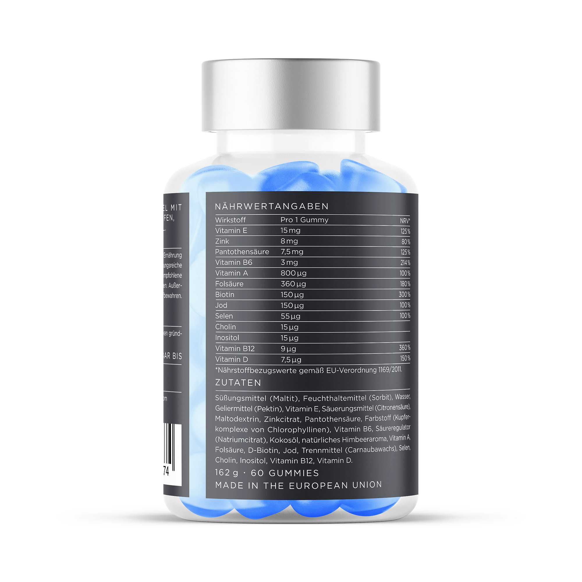 Süßstoff (Maltit) • Feuchthaltemittel (Sorbit) • Wasser • Geliermittel Geliermittel (Pektin) • Vitamin E • Säuerungsmittel (Zitronensäure) • Maltodextrin • Zinkcitrat • Pantothensäure • Farbstoff (Kupferkomplexe von Chlorophyllinen) • Vitamin B6 • Säureregulator (Natriumcitrat) • Kokosnussöl • natürliches Himbeeraroma • Vitamin A • Folsäure • D-Biotin • Jod • Trennmittel (Carnaubawachs) • Selen • Cholin • Inositol • Vitamin B12 • Vitamin D